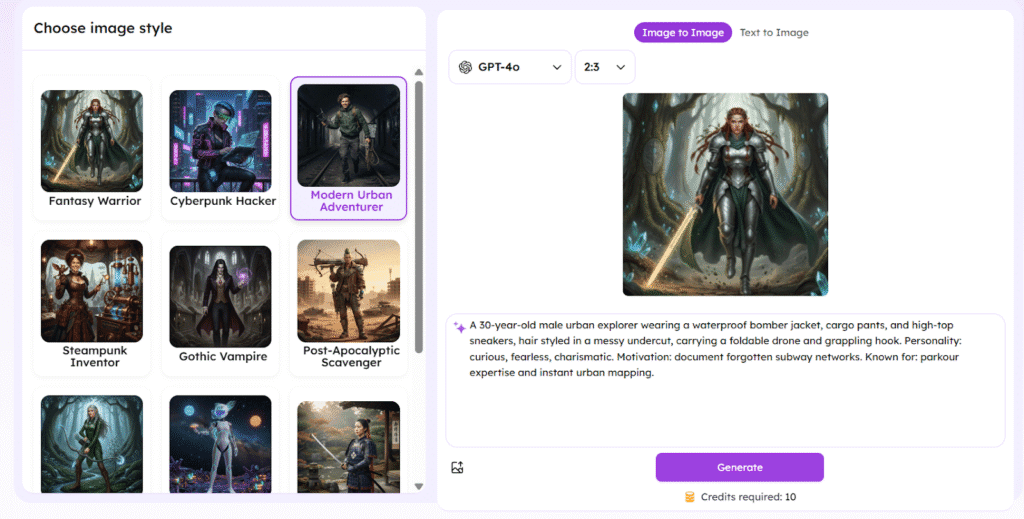 - Multi-input flexibility: Generates characters from text prompts (e.g., “a steampunk engineer with goggles”) or reference images, with room to tweak details.
